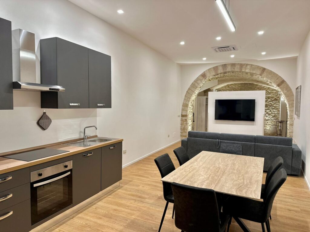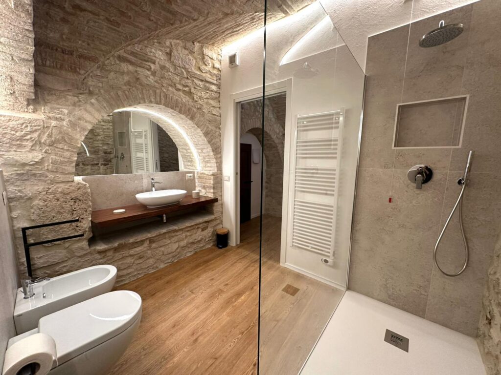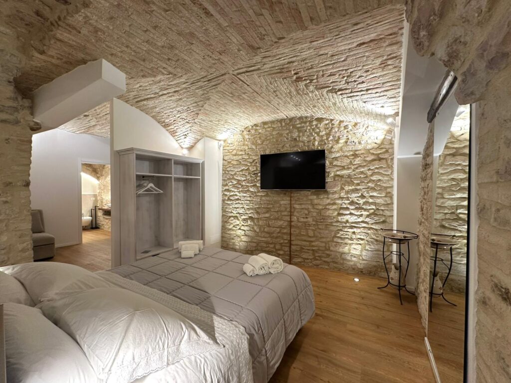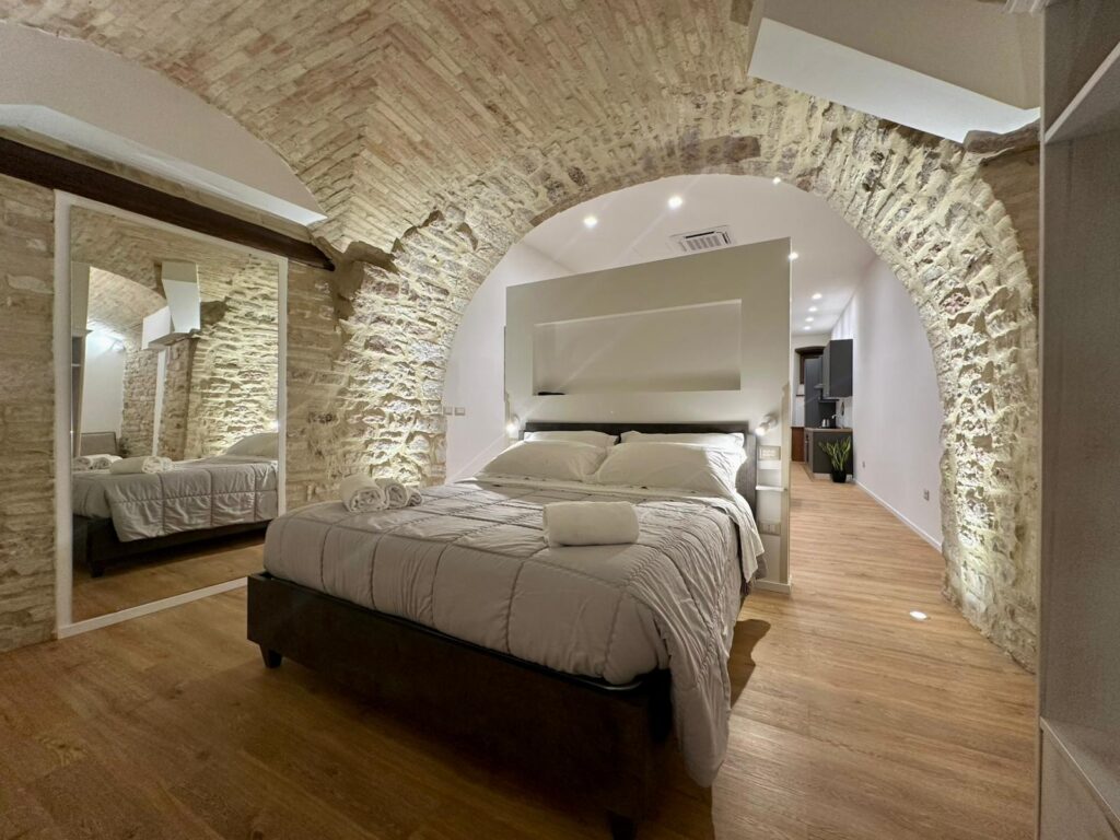 Scopri un appartamento di 65 mq in Via S.Paolo 30D che unisce fascino storico e comfort contemporaneo. Gli ambienti con volte in pietra e illuminazione scenografica creano un’atmosfera unica. La camera matrimoniale è ampia e accogliente; la zona living offre un comodo divano letto e una smart TV, ideale per rilassarsi dopo una giornata ad Assisi. Il bagno è moderno, con doccia walk‑in e finiture di pregio. Una soluzione perfetta per coppie, famiglie o viaggiatori business che cercano stile, praticità e un punto d’appoggio strategico per visitare la città serafica.